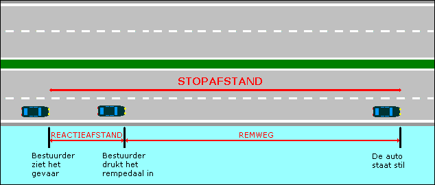 De STOPAFSTAND is de som van de afstand die werd afgelegd tijdens de reactietijd (reactieafstand) en de weg die werd afgelegd tijdens remweg (het effectief duwen op het rempedaal).
