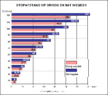 Als je de onderstaande grafieken even bekijkt, dan kun je goed merken dat de STOPAFSTAND bij een nat wegdek langer is dan bij een droog wegdek.