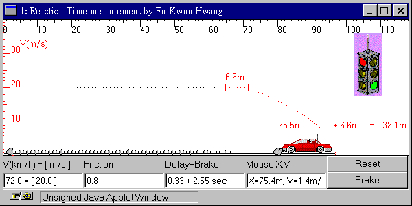 1. Klik zo snel mogelijk op "Rem" met de linker muisknop zodra het stoplicht op rood springt. De tijd tussen het op rood springen van het stoplicht en het remmen is weergegeven in het tekstveld als je reactietijd.