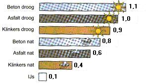 * De wrijvingscoëfficiënt is o. a. afhankelijk van de wrijving van de banden met het wegdek. Daarbij spelen ook weer factoren mee als soort wegdek, weertype, enz.